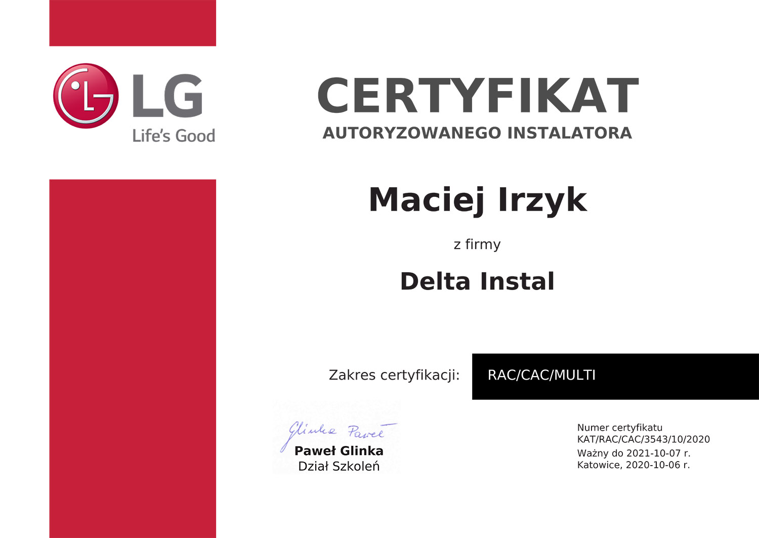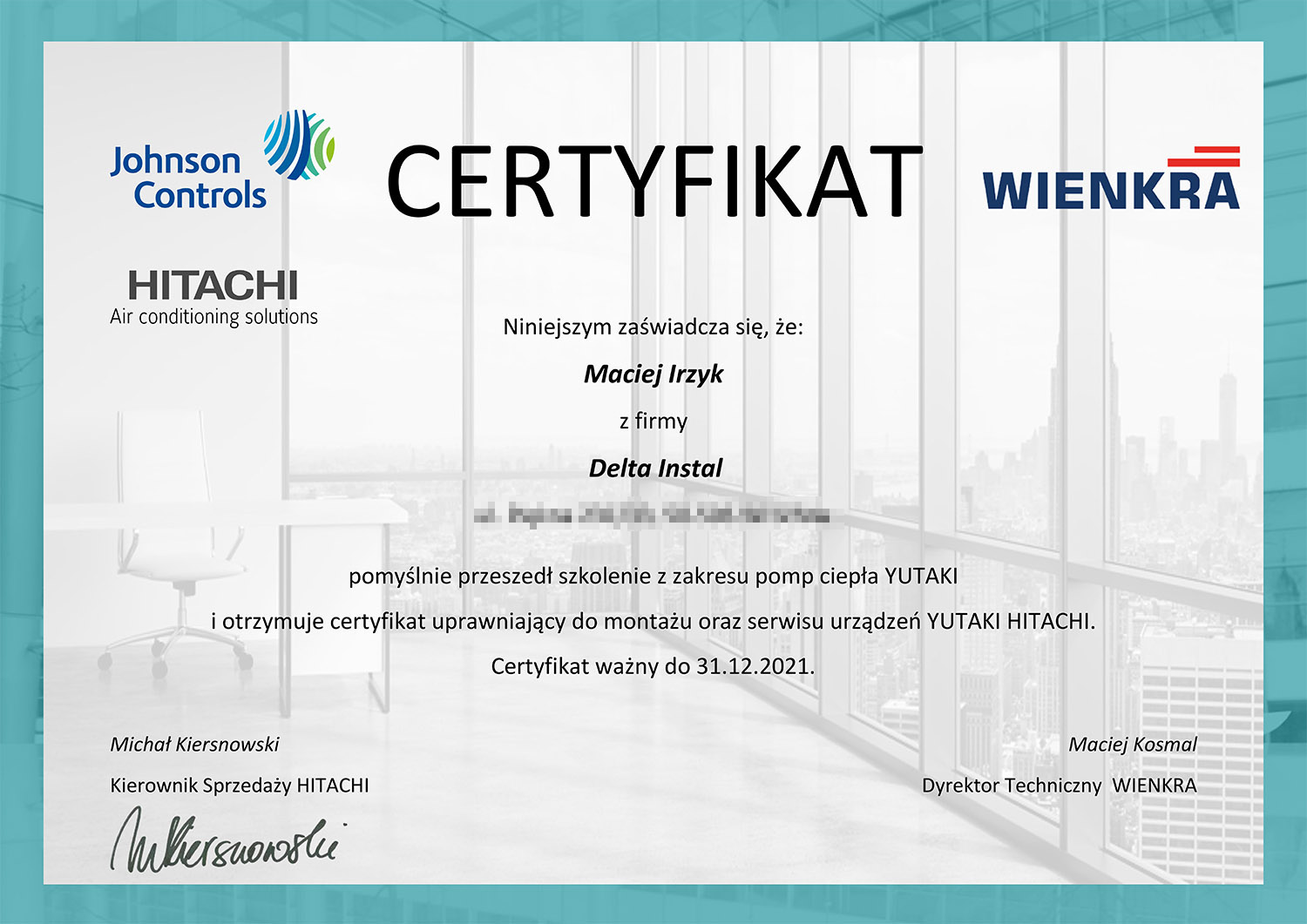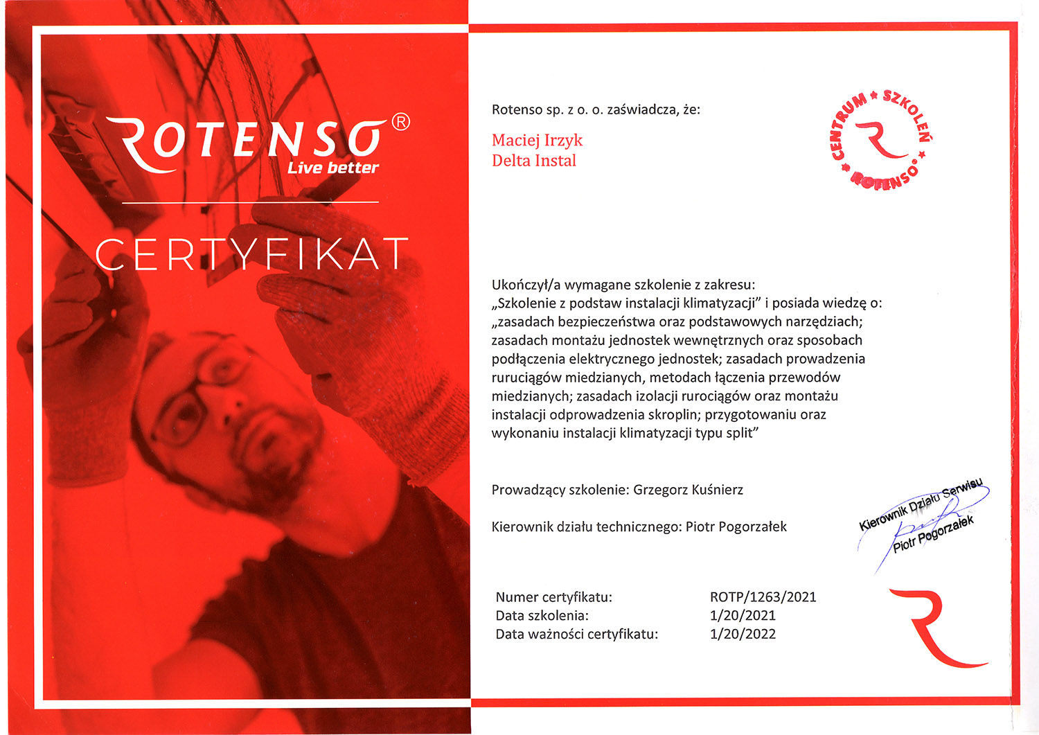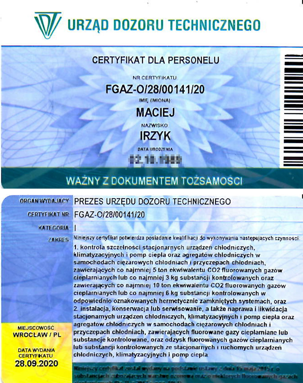 Znam również fach od strony zaplecza. Własnoręcznie wykonałem wiele instalacji klimatyzacji w oparciu o systemy Split, Multisplit, VRV. Odbyłem wiele szkoleń różnych producentów z branży klimatyzacji i chłodnictwa, przeczytałem mnóstwo literatury fachowej. Właśnie te doświadczenia pozwalają mi spojrzeć na wykonywaną pracę z większą precyzją.